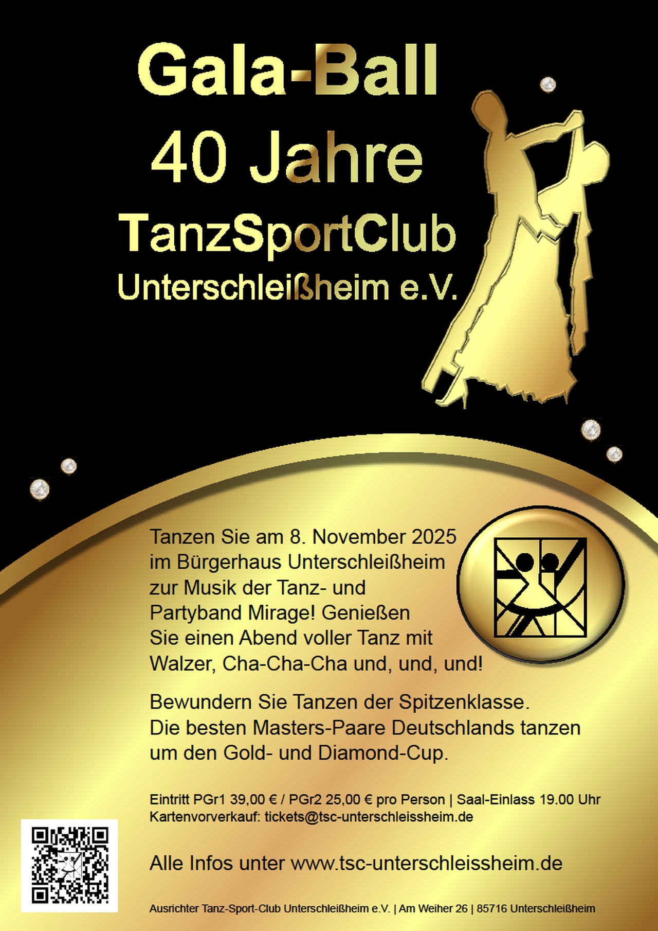 - Alle Paare des Gold- und Diamond-Cup haben freien Eintritt zum Gala-Ball. Die Sitzplätze sind im großen Nebenraum, der direkt mit dem Festsaal verbunden ist. Es gibt keine festen Sitzplätze. Das Treiben im Festsaal wird per Großleinwand übertragen. Wenn Sie am Ball teilnehmen möchten, senden Sie uns bitte eine Mail an tickets@tsc-unterschleissheim.