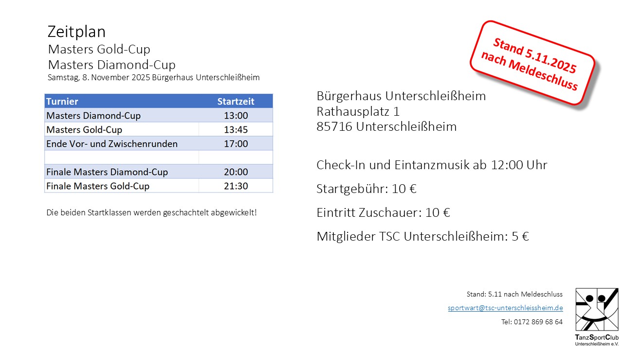 Zeitplan Turniere am 08.11.2025 um den Masters Gold- und Diamond-Cup